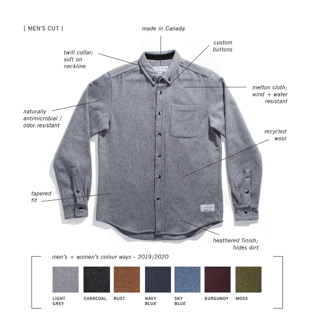 The clothing line ranges from t-shirts, hats and toques to knits, duffel bags, and more. Their newest addition is the Modern Melton Shirt, inspired by the classic Navy pea coat famously worn by James Dean. The naval pea coat has been used by navies across the globe as a standard issued staple. The coat uses 32 ounces of wool split into two sets and tightly woven together, called Melton cloth.