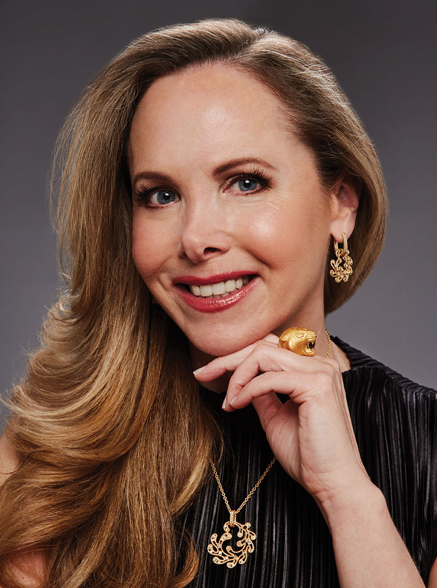 On Marla: Ruedo Collection De Luces pendant and earrings; Bestiary Collection Tiger ring.