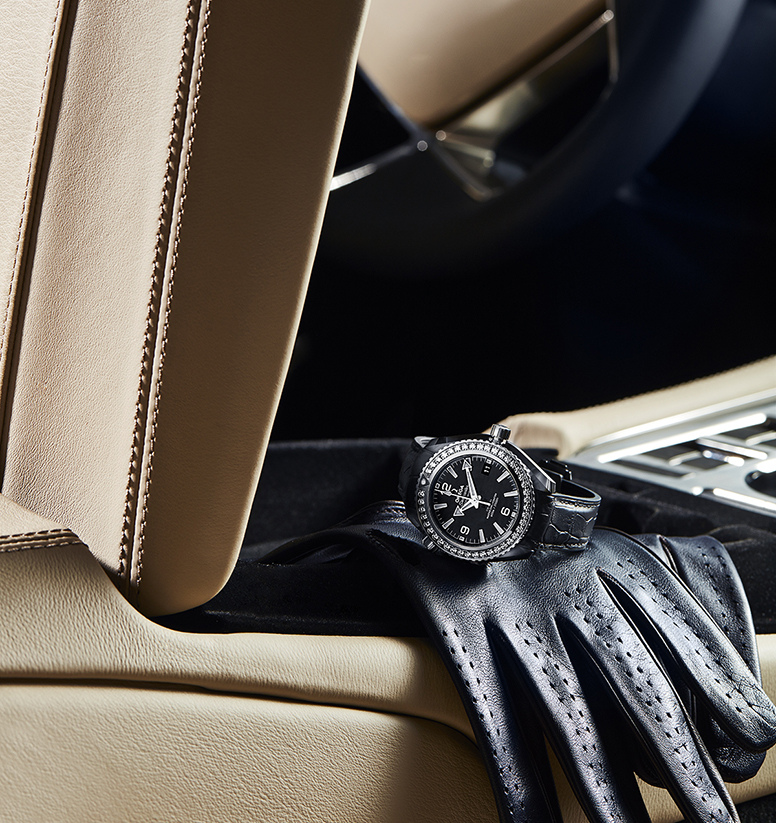 OMEGA Seamaster Planet Ocean Deep Black ($24,200); gloves ($650) by Ermenegildo Zegna, available at Harry Rosen.