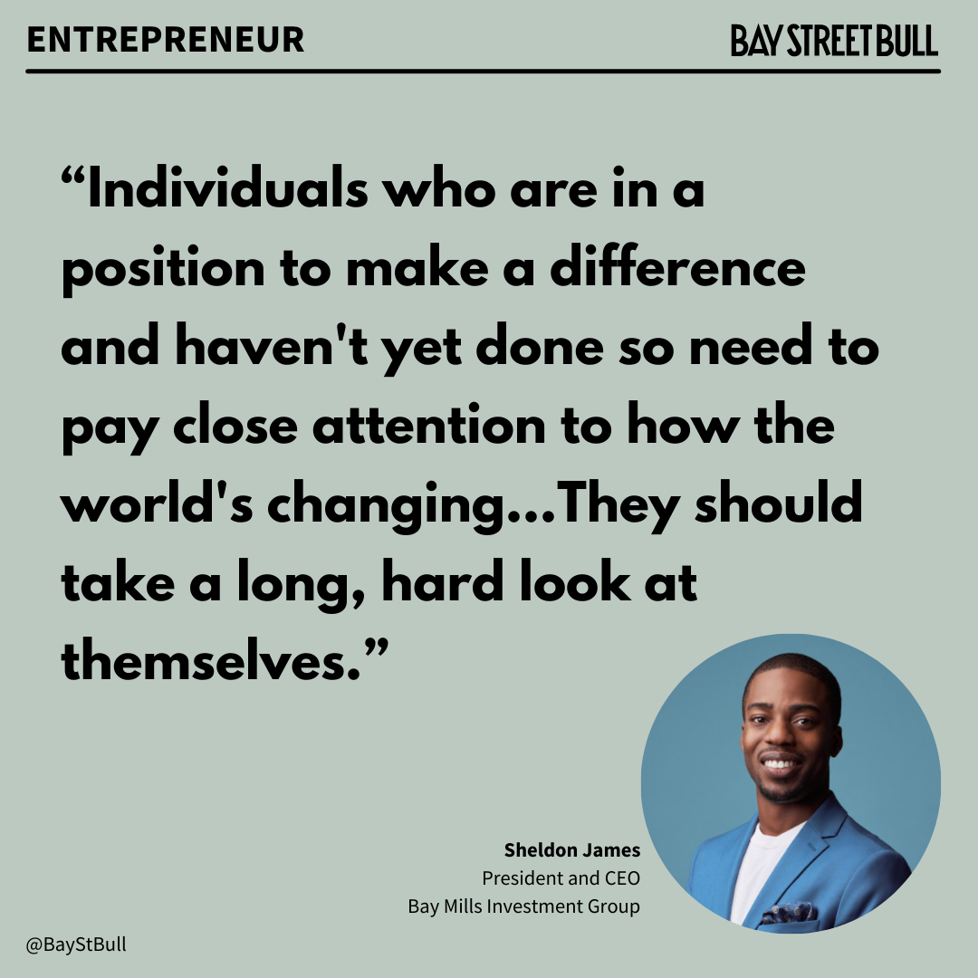 An entrepreneur and former military vet, James started Bay Mills Investment Group alongside his brothers (actors Shamier Anderson and Stephan James) as a way to support others who understood his experience as a person of colour navigating the business landscape.