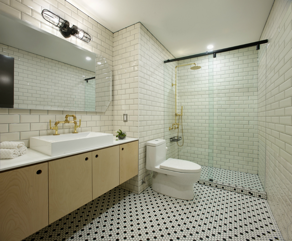 Showcasing dimensional subway tile, rain forest showers and exposed brass faucets, the Cecconi Simone-conceived bathrooms are every bit as on-trend as inherently timeless.