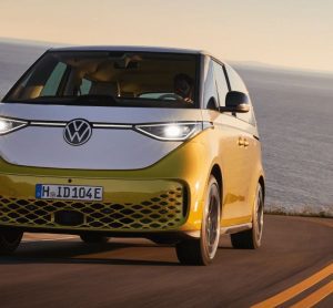 Yellow Volkswagen ID. Buzz electric vehicle driving down a road by the ocean[ Volkswagen ID. ]