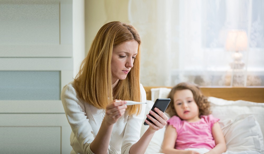 Mother measuring temperature of her ill kid. Sick child with high fever laying in bed and mother holding thermometer. Mother with cell phone calling to doctor